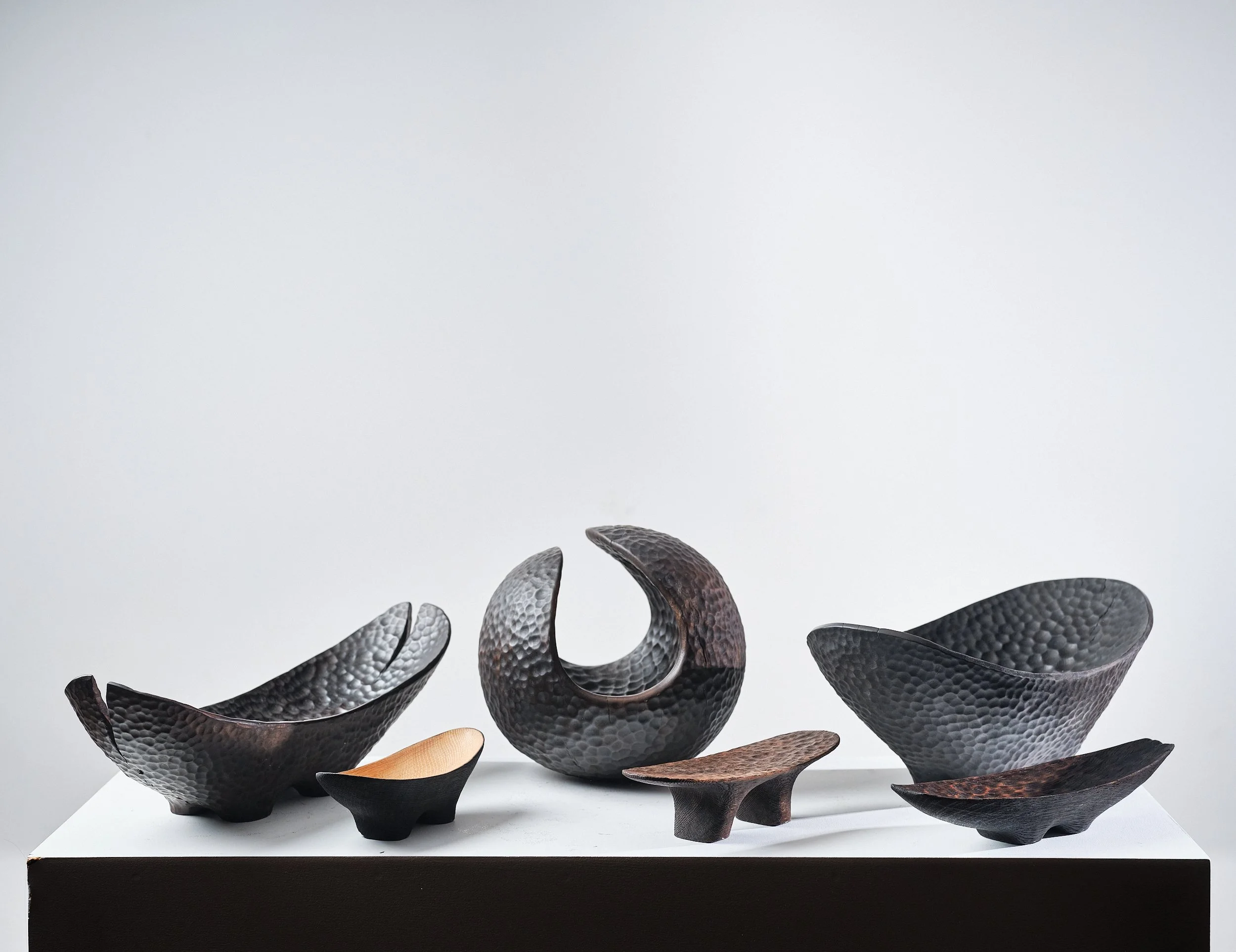 In a nod to the Japanese art of kintsugi, fractures and imperfections are embraced, honoured rather than hidden. In some pieces splits proudly define the aesthetic. In others they are repaired using a pine resin glue, that is hand-made from resin collected from nearby pine trees. Elevating each object’s narrative and emphasising resilience and repair.